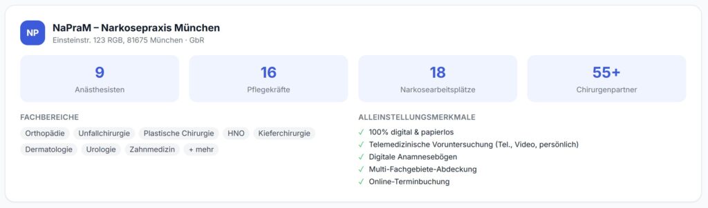 Wir bei NaPraM – Narkosepraxis München stehen für eine echte, verlässliche Partnerschaft: individuelle Abstimmung, klare Kommunikation und konsequent hohe Sicherheitsstandards. Mit moderner technischer Ausstattung und einem eingespielten, erfahrenen Team unterstützen wir die Abläufe in Ihrem OP präzise und effizient.
